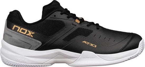 De NOX AT10 Pro padelschoenen in zwart/goud zijn speciaal ontworpen voor de fanatieke padelspeler die geen concessies wil doen aan prestaties of uitstraling. Deze high-performance sportschoenen combineren een strak design met functionele kenmerken die je spel direct ten goede komen.